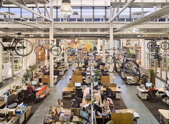 But reduced energy and water consumption are just two of many eco-friendly features which has enabled Clif Bar’s headquarters to earn the highest LEED certification available and to become one of the first buildings in the state to meet California’s 2008 Building Energy Efficiency Standards. More than 12,000 board feet of reclaimed wood was used and, where new wood was used, it was sourced from sustainably managed forests. In addition, recycled denim was used for sound-absorbing panels; lamps, tables and other office furniture were reused from the building’s former tenant; and even the whimsical interior design elements of the building, which includes gravity defying bicycles, kayaks and snowboards, have been reused and repurposed.