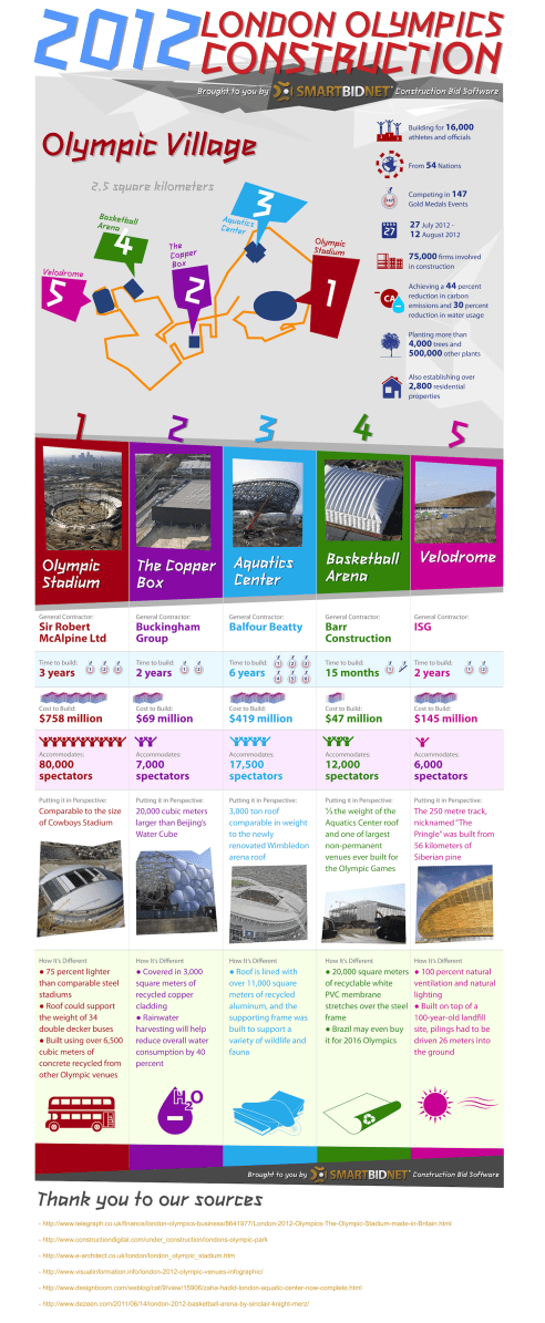 The 2012 Summer Olympics may be over, but in four short years the 2016 Summer Olympics will be hosted in Rio de Janeiro, Brazil. I say “short,” because for the host countries, the coming of the Olympics usually involves a flurry of major infrastructure and construction activities. The total cost of hosting the 2012 Summer Olympics in London has been estimated to be a whopping $14.5 billion with infrastructure and construction accounting for over $11 billion of that amount. Below is an interesting graphic with information on the five major venues constructed for the 2012 Summer Olympics in London.