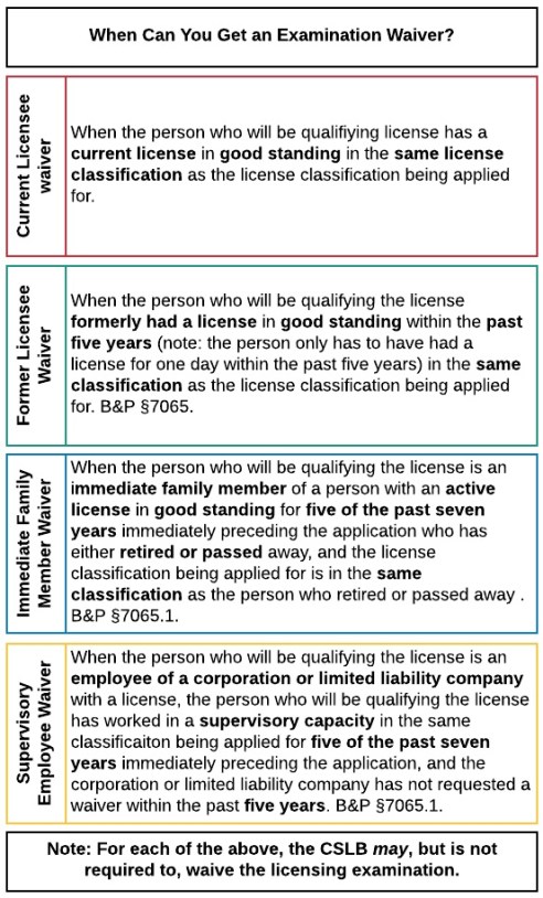 The CSLB may waive the examination requirement if the qualifying individual either: