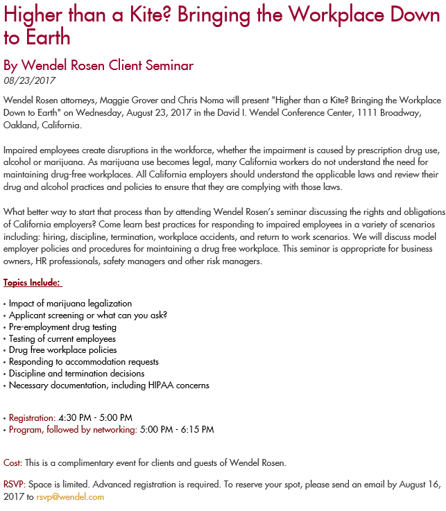 If you’re in or near the San Francisco Bay Area and interested in learning more about workplace drug and alcohol policies come and join us in Oakland on August 23, 2017 from 4:30 p.m. to 6:15 p.m. for Wendel Rosen’s Employment Group’s seminar “Higher than a Kite? Bringing the Workplace Down to Earth.” To RSVP email rsvp@wendel.com.