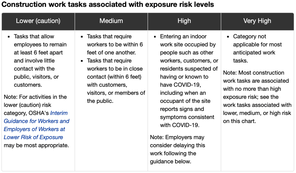 The new guidance suggests that construction employers analyze potential coronavirus risks along a spectrum from “Lower” to “Very High”: