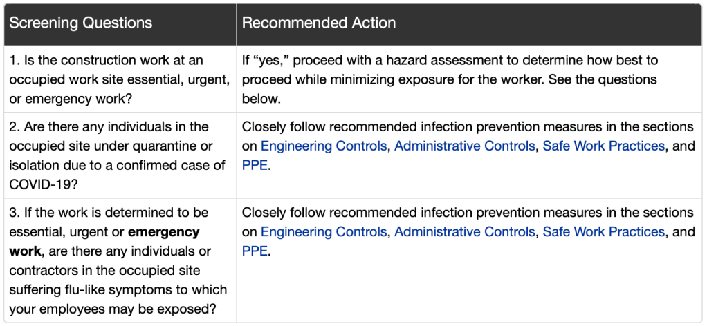 The guidance provides sample questions for screening work assignments before sending a a worker to perform construction activities in an indoor work environment: